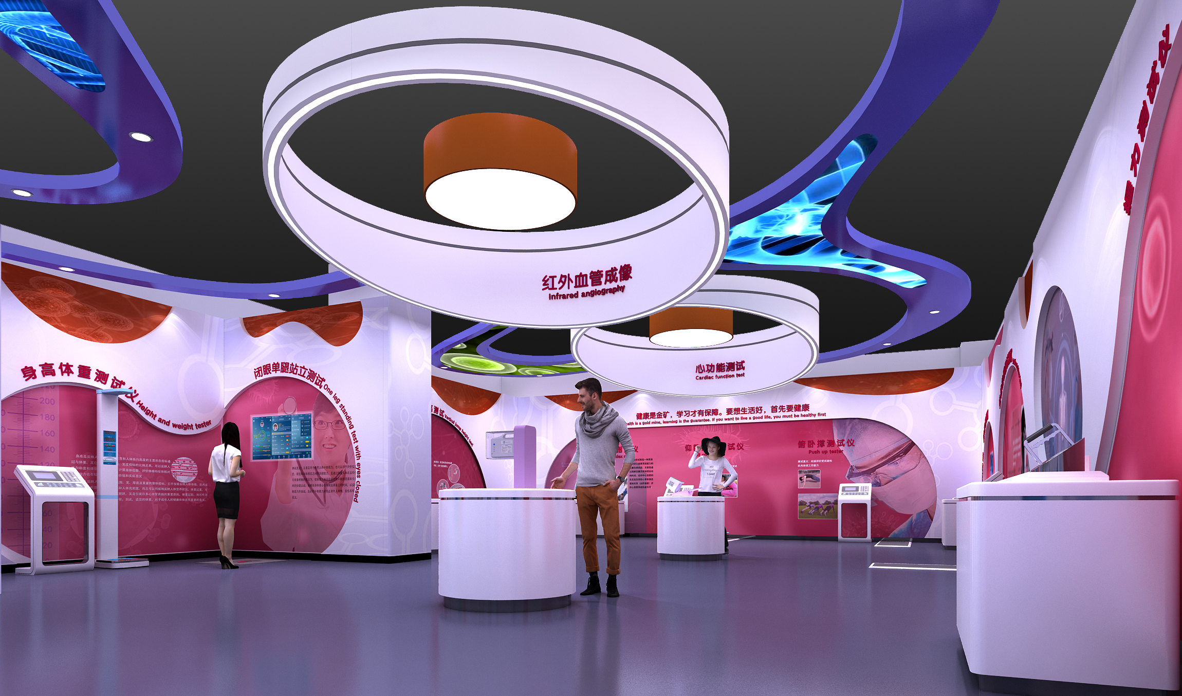 该项目区分为序厅、爱的工程、生命探秘展厅、健康生活展厅、安全实训厅、健康中国2030-1、健康中国2030-2、健康中国2030-3、心理咨询师、演播大厅共计10个区域,每个区域的布展风格各有不同,各个区域涉及天棚、地面、墙体艺术改造。